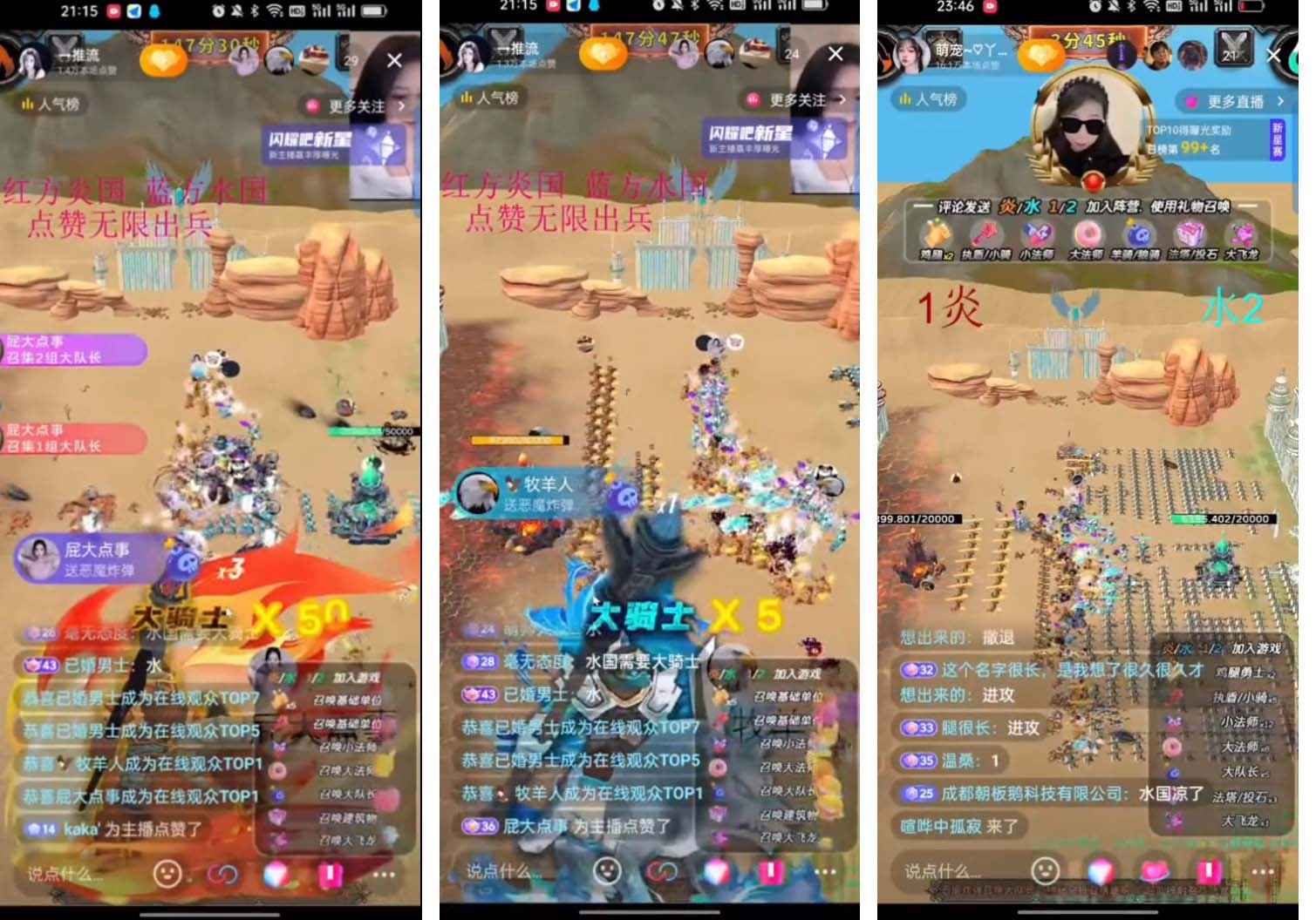 观众输入【炎】【1】或【水】【2】后会自动生成一个基础军队,通过点赞、评论、礼物进行战前军队部署。可以通过【进攻】【撤退】进行部队的控制,通过实时的操作,极限消耗对方阵营的兵力。游戏正上方为攻守方识别,游戏开始时,系统随机分配炎国、水国为进攻防守方。在规定时间内,进攻方未攻下防守方,则攻守方进行转换;若攻守方转换后,攻方未进攻下守方,则守方获得胜利。